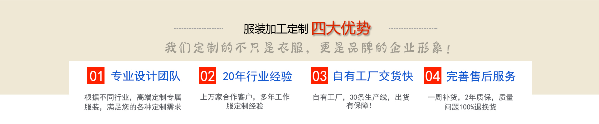 服裝加工網(wǎng)是一家及設(shè)計、生產(chǎn)、銷售為一體的專業(yè)服裝生產(chǎn)型企業(yè), 根據(jù)客戶需求定制西服襯衫工作服大衣棉服等產(chǎn)品,近二十年工作服職業(yè)裝定做經(jīng)驗積累, 工期短交貨及時,免費提供團(tuán)體定制上門量體服務(wù),送貨上門,免費修改,完善的售后服務(wù), 滿足您的各種定制需求!